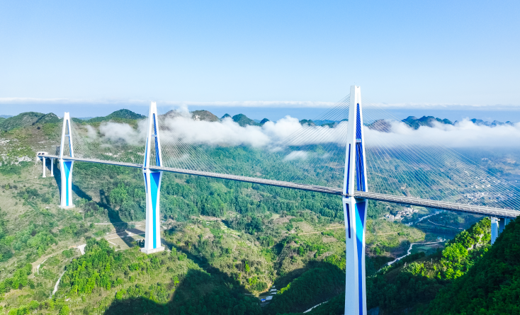 青山間,綠水上,三座淺藍色的鉆石塔頂直刺藍天,264根長短不一的拉索如翩躚起舞的苗族裙擺,云騰霧繞中,平塘大橋與山水峽谷交相輝映,構成一幅巧奪天工的人間美景。