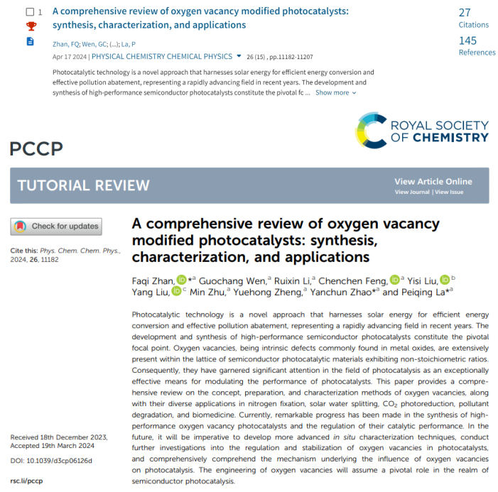 同時,團隊2024年關于光催化氧空位的研究工作“A Comprehensive Review on Oxygen Vacancies Modified Photocatalysts: Synthesis, Characterization, and Applications”發表在《Physical Chemistry Chemical Physics》期刊上的論文,兩次(2025年1月和3月)入選ESI高被引論文,發表至今引用次數已達27次。(圖/文:占發琦;審核:石玗)
