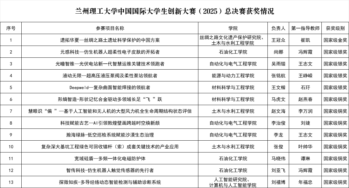 10月12日至15日,中國國際大學生創新大賽(2025)總決賽現場賽在鄭州大學舉辦,學校黨委常委、副校長韓建平帶隊參賽。經過激烈角逐,蘭州理工大學參賽隊最終從全球5673所學校619萬個項目中脫穎而出,斬獲全國總決賽金獎1項、銀獎4項和銅獎8項,創學校歷史最好成績。