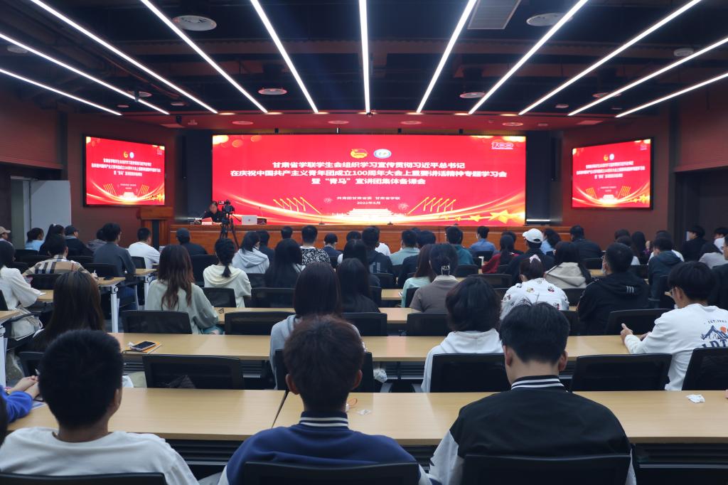 5月21日上午,甘肅省學(xué)聯(lián)學(xué)生會組織學(xué)習宣傳貫徹習近平總書記慶祝中國共產(chǎn)主義青年團成立100周年大會上重要講話精神專題學(xué)習會暨“青馬”宣講團集體備課會在我校彭家坪校區(qū)圖書館109報告廳召開。團省委副書記李華龍、團省委學(xué)校部全體干部、省學(xué)聯(lián)駐會執(zhí)行主席和我校團委、學(xué)生會工作人員、青馬學(xué)員共計100余人在主會場參加會議。同時,全省高校團委主要負責人、學(xué)生會(研究生會)專職秘書長、主席團成員,市州學(xué)聯(lián)秘書長,省學(xué)聯(lián)第十屆主席團成員團體代表、省學(xué)聯(lián)第十屆委員會委員團體代表,省青年馬克思主義者培養(yǎng)工程高校班學(xué)員、“青馬宣講團”成員在線參加了會議。