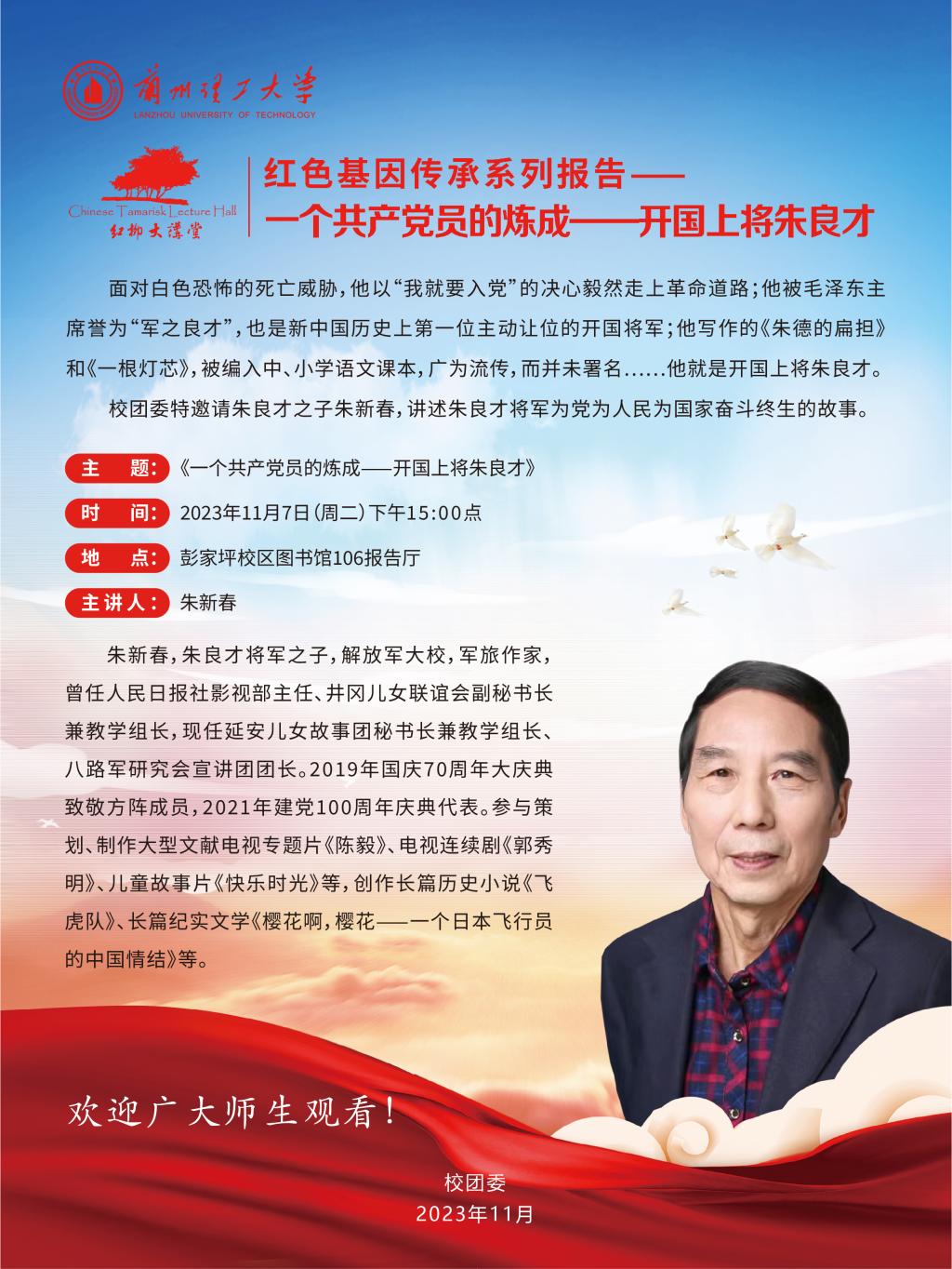 “紅柳大講堂”紅色基因傳承系列報告第二講特邀請朱良才之子朱新春,講述朱良才將軍為黨為人民為國家奮斗終生的故事。