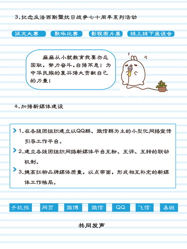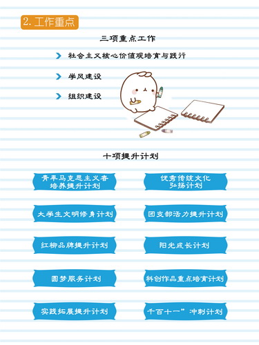 為了使大學(xué)生思想政治教育工作更好地貼近學(xué)生、吸引學(xué)生、凝聚學(xué)生,近日,校團委探索引導(dǎo)青年的新途徑,“圖說校團委2015年工作計劃要點”新鮮出爐了。這張萌圖以生動的語言和富有創(chuàng)意的形式,將我校2015年的共青團工作進行了一次有趣的“自我介紹”,這種極具親和力的宣傳方式深受同學(xué)們的喜愛和歡迎,漫畫獲贊“萌萌噠”。