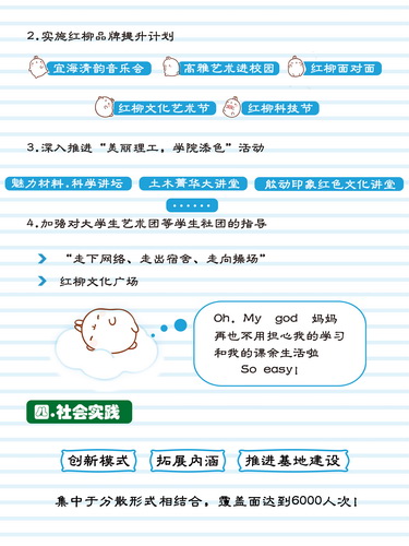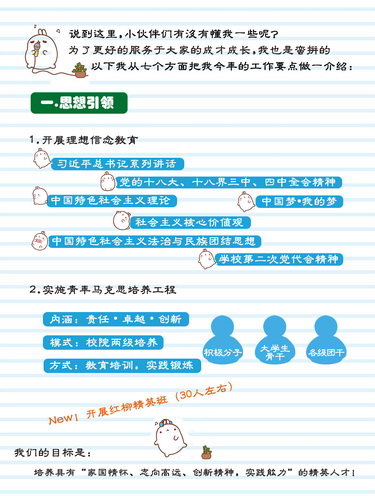 “作為小伙伴們的好‘盆’友,我的目標(biāo)絕對不僅僅是沒有蛀牙”、“為了更好地服務(wù)于大家的成長成才,我也是蠻拼的”,這些流行幽默的語言,配上活潑生動的卡通形象和小清新的畫面,不僅向同學(xué)們介紹了共青團工作的指導(dǎo)思想、“六新”工作目標(biāo)和“24字”工作理念,還從思想引領(lǐng)、學(xué)風(fēng)促建、校園文化、心理健康等7個方面,具體講述了團學(xué)特色活動和貼心服務(wù),讓同學(xué)們進一步認(rèn)識和理解共青團工作是在“干什么”,號召“紅柳青年”們參與到校園文化活動中來。