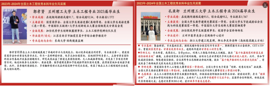 2020級本科生張瑩博榮獲2022年度中國大學生自強之星、2023年甘肅省大學生年度人物,2023屆郭孝賢、2024屆孔亞軒被評為全國土木工程優秀本科畢業生。2024年甘肅省大學生田徑錦標賽男子1500米項目上,博士研究生李少飛同學,以4分24秒9的優異成績奪得我校在該項目上的首枚金牌。