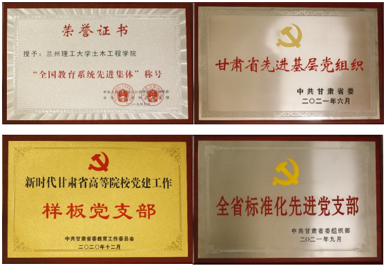 學院黨委被評為第二批新時代甘肅省高等院校黨建“標桿院系”,建筑工程教師第1黨支部獲首批“全國黨建工作樣板支部”和“全省先進基層黨組織”“全省標準化先進黨支部”,建工教師第二黨支部被評為第一批新時代甘肅省高等院校黨建“樣板黨支部”,入選甘肅省高等學校優秀黨支部書記“雙帶頭人”。